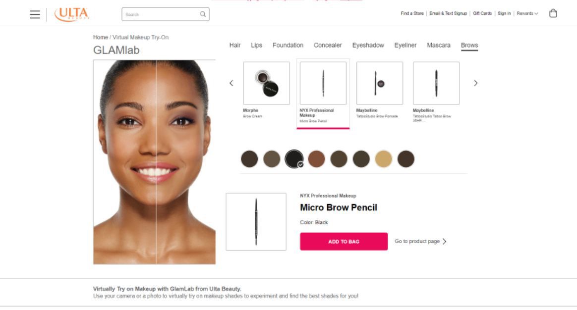 Dans cet exemple, la fonctionnalité d'essayer virtuellement le maquillage sur Ulta n'est pas évidente à trouver et connaît également des problèmes d'utilisation notamment sur la façon de changer de produit. Les utilisateurs témoignent aussi de délais de chargement jugés trop longs.
